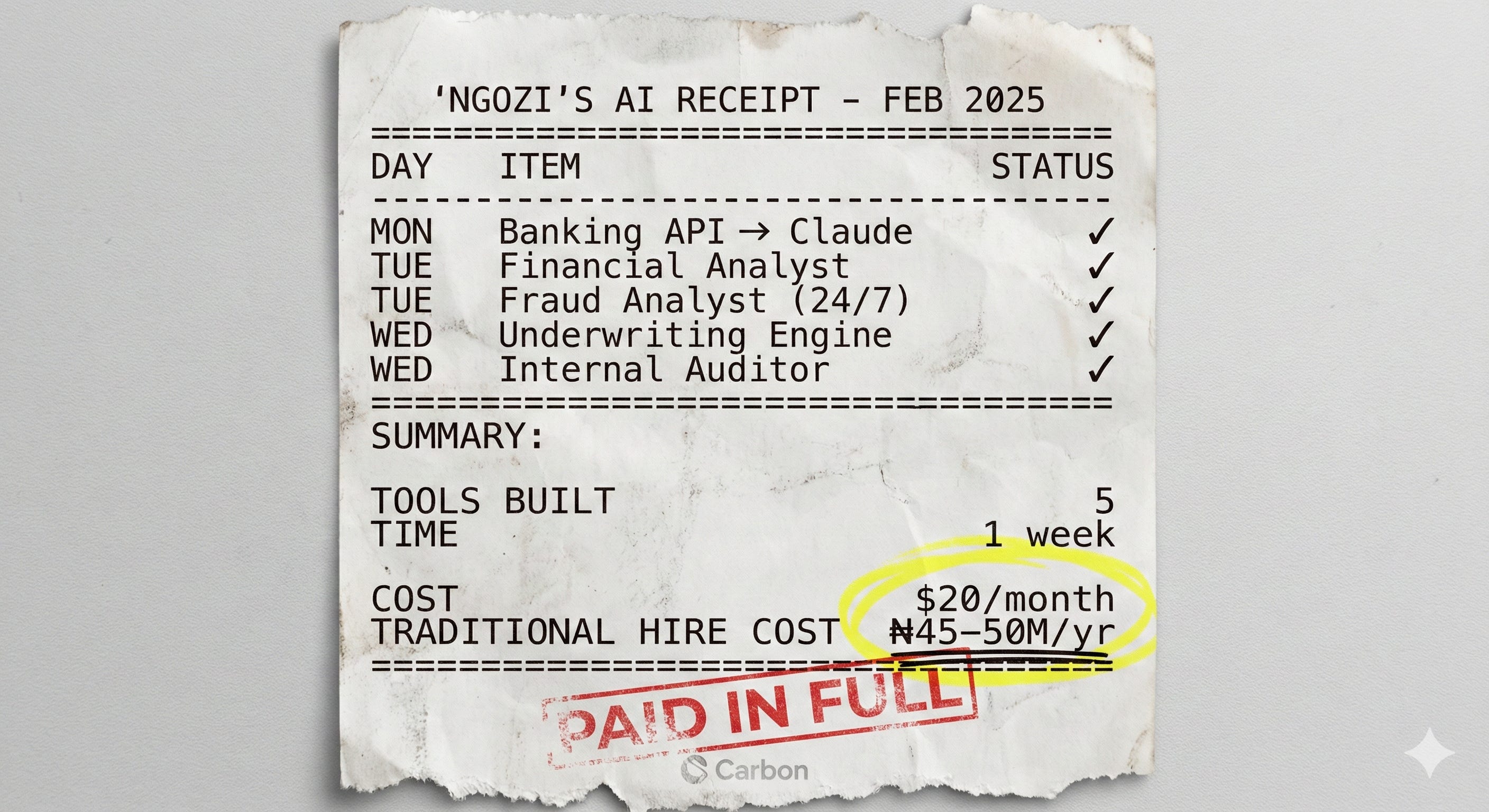 Wednesday (morning): Built a lending underwriting engine. Feed it 100 pages of bank statement, credit reports, KYC documents. Ten minutes later: decision ready.
